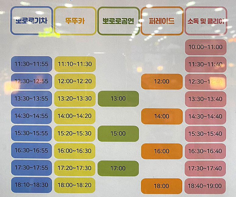 시간표를 보면 11시 30분에 입장을 해야 뽀로로기차, 뚜뚜카, 뽀로로공연, 퍼레이드까지 다 보고 올 수 있다.