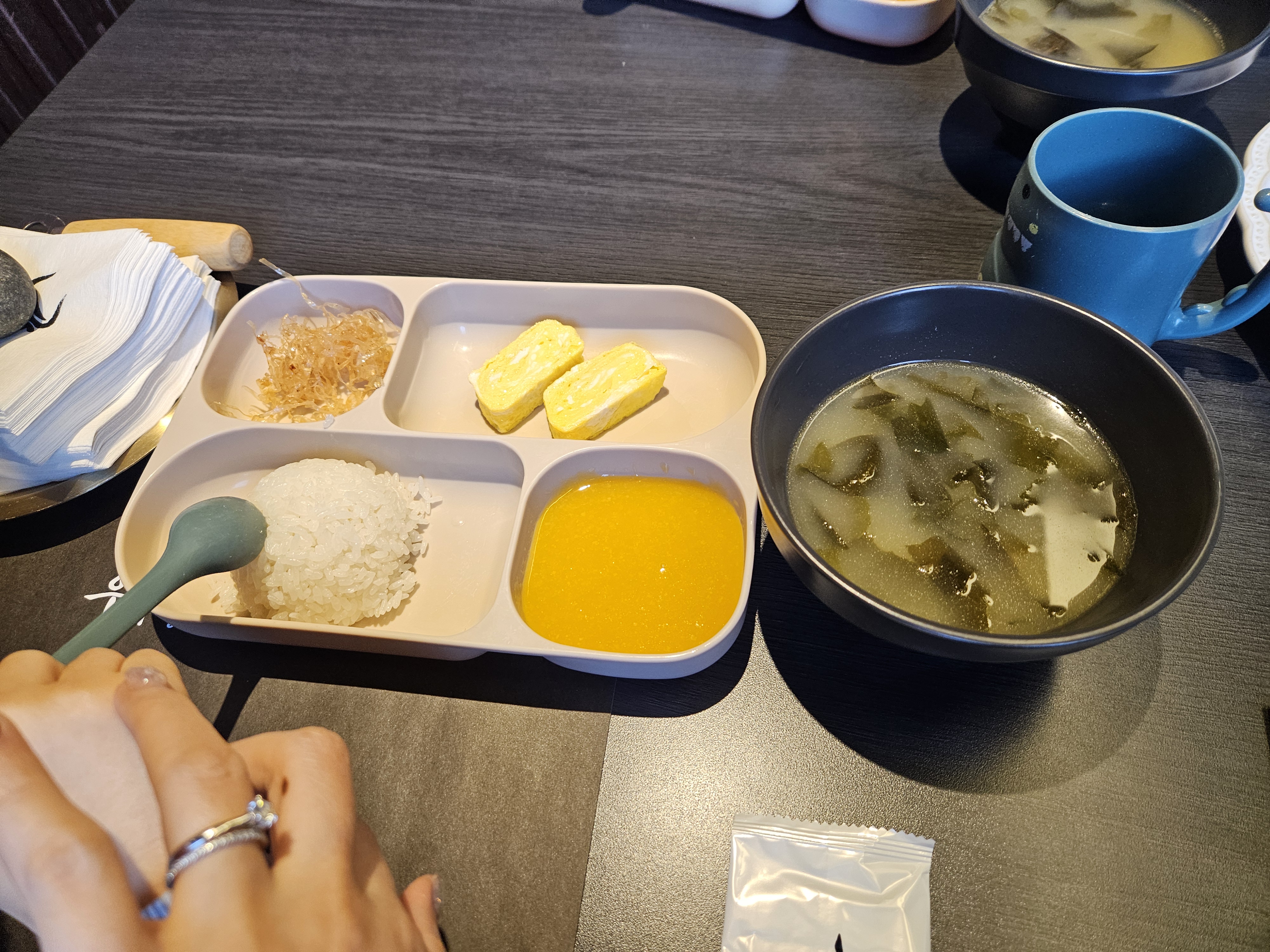 아이에게 밥, 미역국, 호박죽, 계란말이, 마른오징어 반찬이 나옵니다 (혜자)